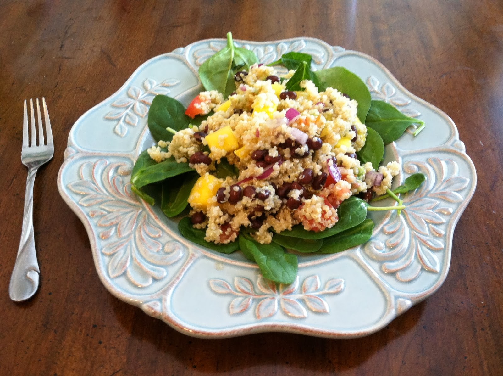Spoon 3/4 cup of the Quinoa Mango mix onto your spinach/lettuce and serve!